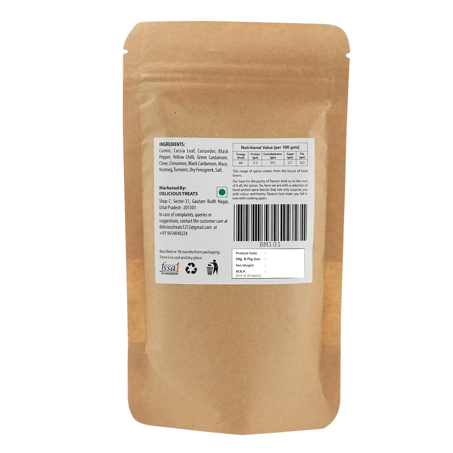 Manufacturer Delicious Treats, Delicious Treats, Shop No. 7, Sector 31, Gautam Buddh Nagar, Uttar Pradesh 201301. e-mail: info@eartheneats.com