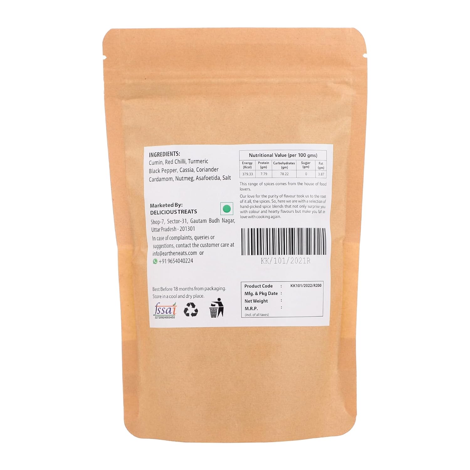 | Manufacturer Contact Information | Delicious Treats, Shop No. 7, Sector 31, Gautam Buddh Nagar, Uttar Pradesh 201301. e-mail: info@eartheneats.com |