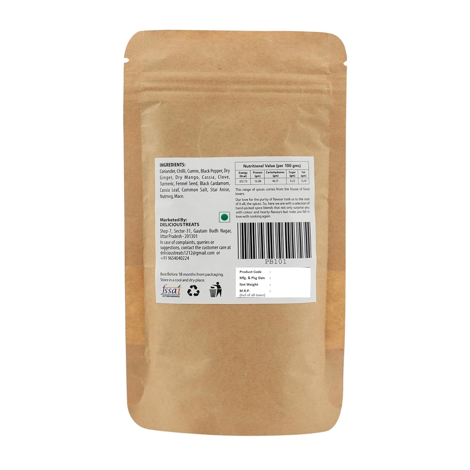 | Manufacturer Contact Information | Delicious Treats, Shop No. 7, Sector 31, Gautam Buddh Nagar, Uttar Pradesh 201301. e-mail: info@eartheneats.com |